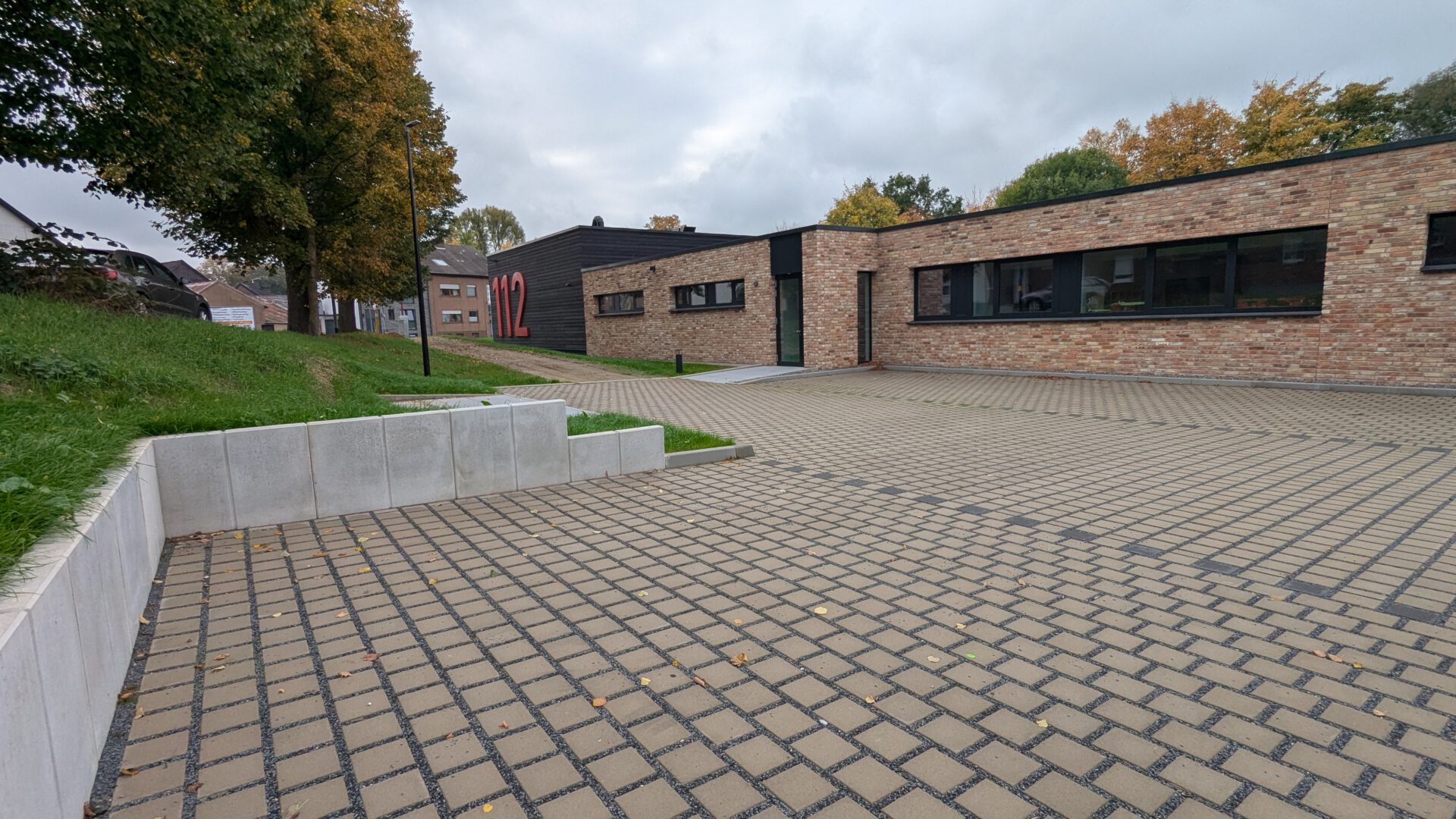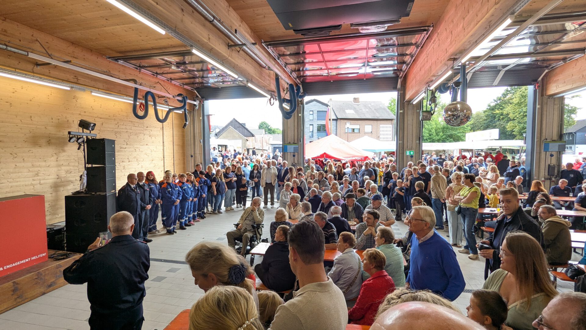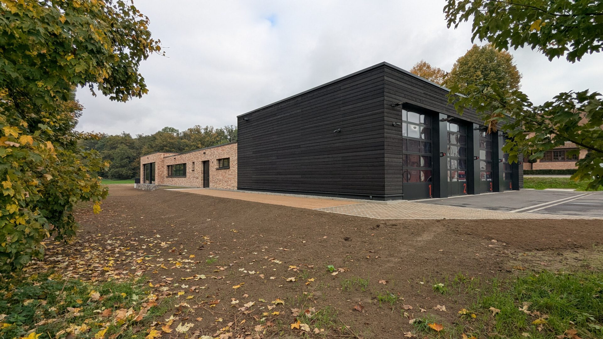 Es schließt sich ein von Feuerwehr und anderen ortsansässigen Vereinen nutzbarer Gemeinschaftsbereich mit großem Gemeindesaal und angrenzendem Küchenbereich sowie Lager an. Dieser hat einerseits eine direkte Verbindung zum Verwaltungstrakt der Löschgruppe und kann so für größere Schulungen zur Verfügung stehen (eine flexible Teilung könnte in die Überlegungen mit einbezogen werden), andererseits bietet der große Gemeinschaftsraum mit eigenem Foyer am Nordende des Gesamtkomplexes Platz für die Veranstaltung diverser Feste und Gemeinschaftsprojekte von Vereinen und Institutionen der Gemeinde Nörvenich, die das Gemeindeleben aktiv mitgestalten und Impulse für eine bessere Gemeinschaft in der Gemeinde geben. Der Eingangsbereich zum Gemeindesaal wird durch einen kleinen gepflasterten Vorplatz, eine Rampe zur barrierefreien Erschließung und zwei Pflanzbecken gestaltet.
