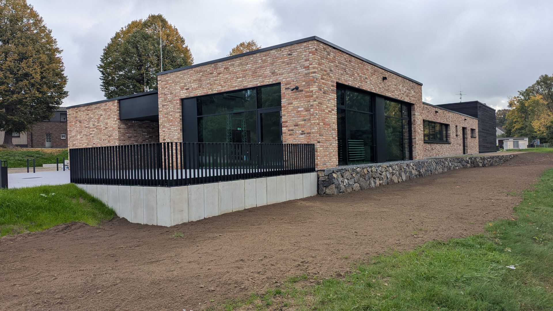 Das Gebäude hält sich durch die Eingeschossigkeit und die Lage in der Aue im Hintergrund und verdeckt für die Anwohner nicht den Blick auf das Schloss. Zudem orientiert es sich in seiner architektonischen Gestaltung und der Wahl der Materialien am vorherrschenden Ortsbild und seiner Erscheinung sowie mit seiner Klinkerfassade auch am das Ortsbild prägenden Monument des Nörvenicher Schlosses.